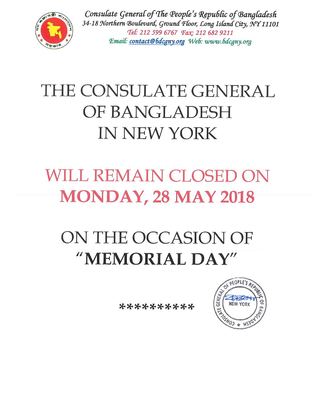 Holiday Notice from the Consulate General of Bangladesh in New York : Bangladesh Consulate General will remain closed on Monday, 28 May 2018 on the occasion of ‘Memorial Day’