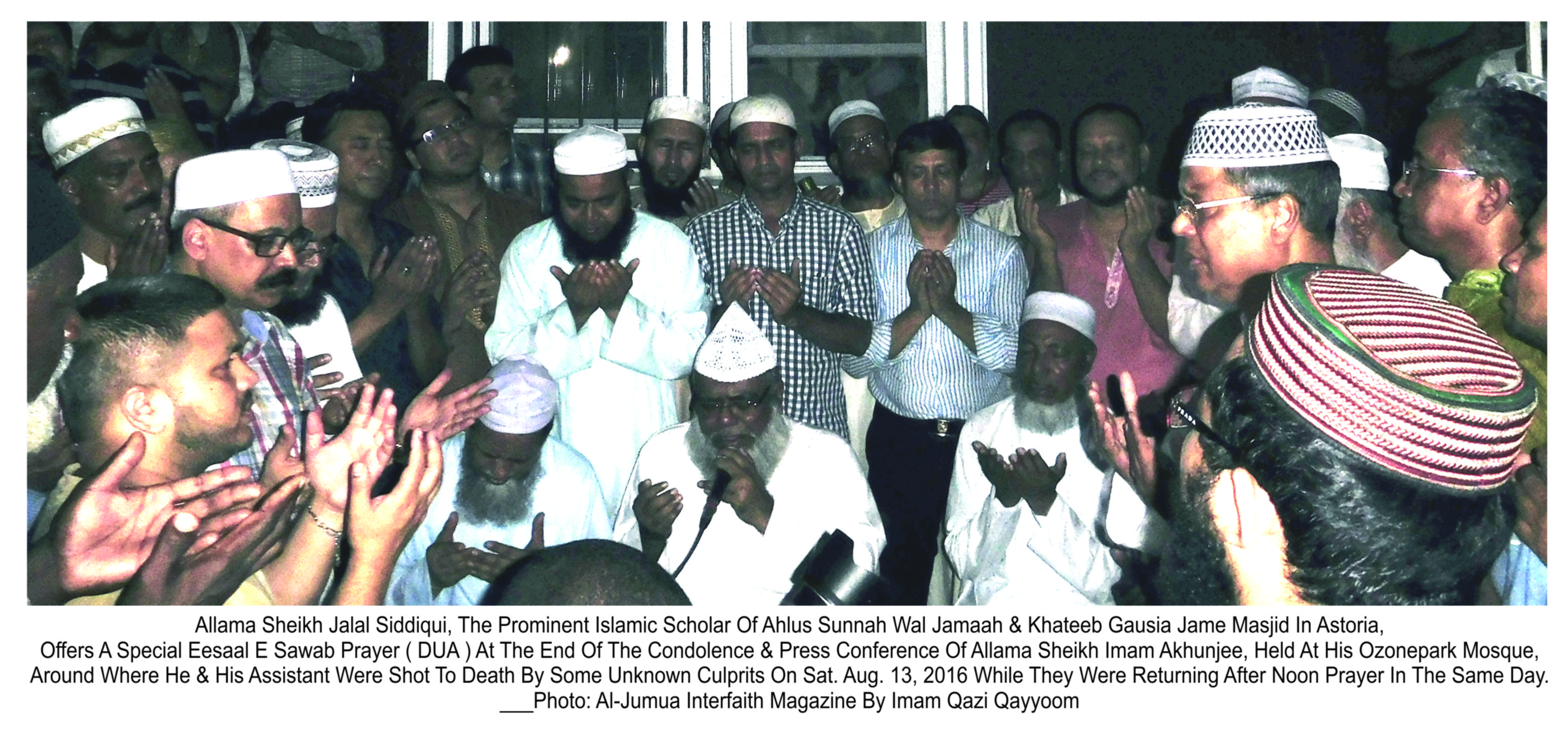 Qazi Qayyoom : We, the New York Muslim Community are shocked! “Innaalillaahi Wainnaa Innaa Ilaihi Raajiuoon” as we came to know that, Sheikh Alauddin Akhunji (55), a Bangladeshi Sunni imam was shot to death (became SHAHEED, a martyr) by the unknown gunmen while he and his assistant Tara Uddin (64) were returning from his “Alfurqan Jame Masjid” Mosque in Ozonepark, Brooklyn, NY. after Zhuhr, the noon prayer at around 2:00 pm, of August 13, 2016. He was Spot death but taken to the nearest Jamaica Hospital, his assistant was announced death after few hours of fighting with his life at the same hospital, both were shot by head. No clues or motive were found yet. Police are looking for the suspects from various sources they may have, but not ready to say the incident was a hate crime of what the community and neighbors were doubt. In the evening of the same day of incident, A Prayer, Condolence & Press Conference were held at Imam Akhunjees Al-Furqan Mosque in Ozonepark where Imams, community leaders, NYPD & other Security reps and the neighbors gathered to condemn strongly such incident and to find the culprits as soon as possible and to bring them to justice. “WE WANT JUSTICE” placards were shown at the programs. Allama Imam Jalal Siddiqui led a special prayer at the end. He also took an oath of allegiance from the Imams & Community Leaders to work together for the achievement of strength and to prevent such incidents in future. He also called a special meeting with Imams & Islamic scholars to discuss more on the matter, which is due on Wednesday, Aug. 17, after Zhuhr prayer at the same Masjid. Funeral prayers of both will be held at the mosque but the time is not announced yet. families will decide for the burials whether will be here or to be sent to Bangladesh. Press Release.