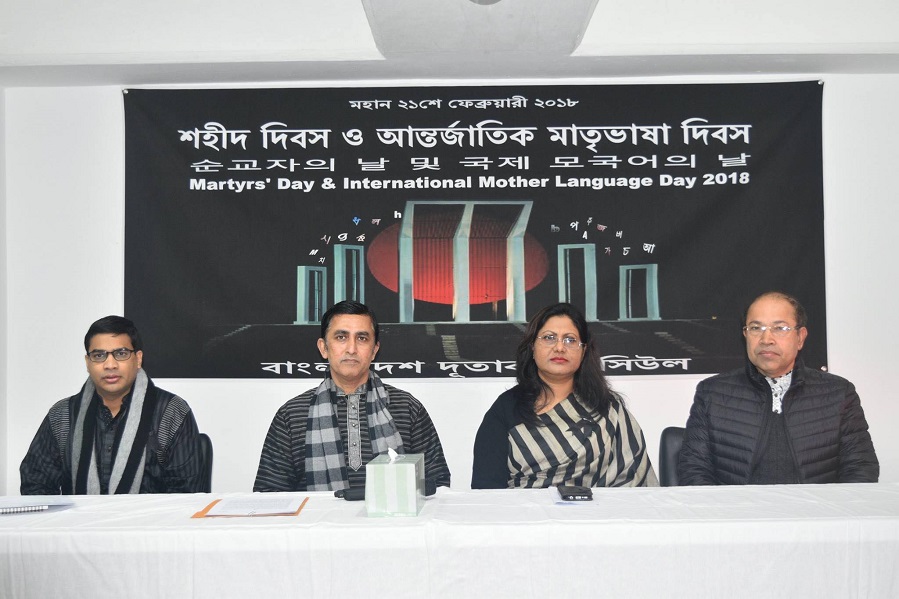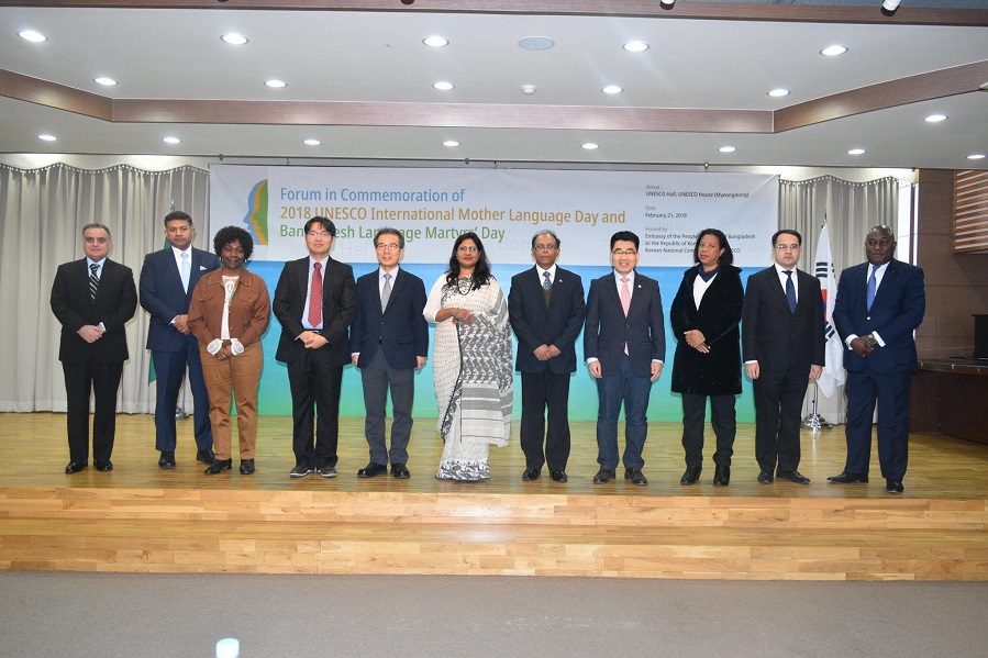 Most important programme of the day was the “Forum in Commemoration of 2018 UNESCO International Mother Language Day and Bangladesh Language Martyrs’ Day” jointly organized with the Korean National Commission for UNESCO (KNCU) at latter’s place. The event was attended by Mr. Kim Kwangho, Secretary-General of KNCU, Mr. Wee Joonseok, Director, Ministry of Foreign Affairs, Ambassadors of India, Sri Lanka, Jordan, Cambodia, Ghana, Timor-Leste, Ivory Coast, diplomats of other embassies and members of Bangladesh community in Korea. At the outset, the message by H.E. Ms. Audrey Azoulay, Director-General of UNESCO was read out. Then Secretary-General of KNCU delivered the opening remarks and Bangladesh Ambassador delivered welcome remarks. For the first time MOFA, Korea gave a message on this occasion, which was read out by Director Mr. Wee Joonseo.Mr. Keshab K. Adhikary, Assistant Professor, Inha University delivered the keynote speech. He mainly highlighted on the background of the Language Movement, its significance and similarity of language struggle between Bangladesh and Korea in their respective history. Mr. Wonhyong Cho, Lecturer, Seoul National University and Mr. Namwook Kang, Assistant Professor, Gyeongin National University discussed on the keynote speech.