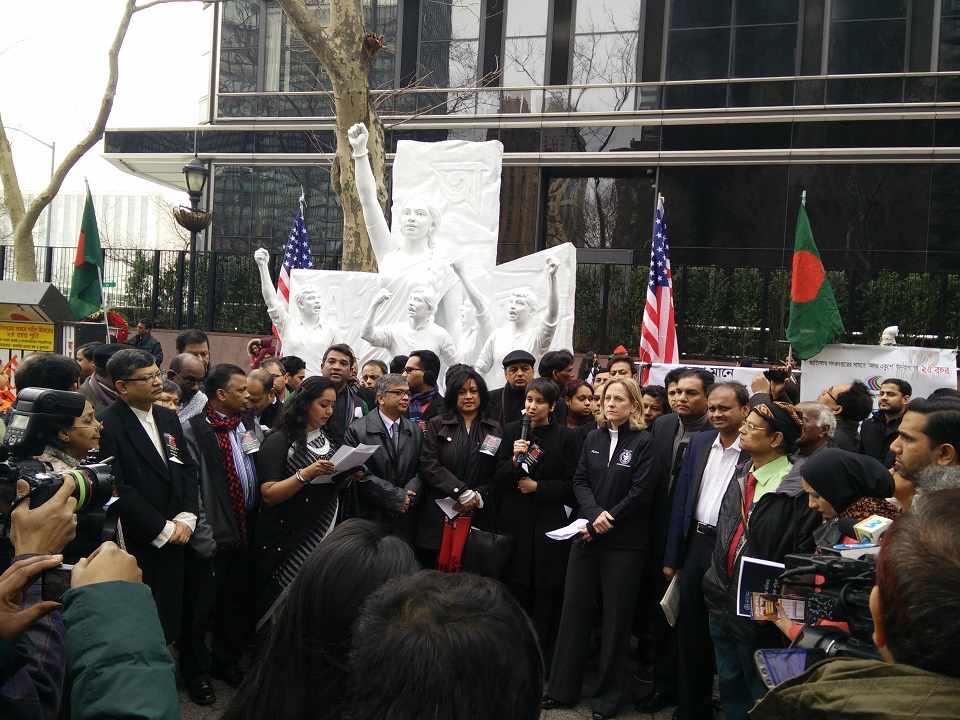 On 20th February 2016, the First Hour of Ekushey February was celebrated in New York at 1:01 pm local time, which is equivalent to the First hour of Ekushey February (12:01am of 21st February) in Bangladesh. The event took place in 1st Avenue and 47th Street in front of United Nation, beside the sculpture of International Mother Language Day, where a temporary Martyrs Tower of Ekushey February was placed. From the Government of USA, Deputy Mayor of Philadelphia & Advisor to the President Barack Obama’s Advisory Commission on Asian Americans and Pacific Islanders- Dr. Nina Ahmad, Commissioner Immigration Affair of New York Mayor’s Office- Ms. Nisha Agarwal, Queens Borough President- Ms. Melinda Katz, Regional Representative of the Office of New York Governor- Mr. Hersh k Parekh, Representative from the Office of New York Comptroller- Ms. Aliya Latif, greeted the event by placing floral wreath at the Martyrs Tower of Ekushey February.