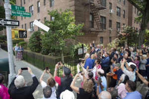 PHOTO CAPTION: Family members, elected officials and friends gather to unveil ‘Mary Audrey Gallagher Way’ on 91st Street between Northern Boulevard and 34th Avenue in Jackson Heights. Photo by John McCarten.) Press Release.
