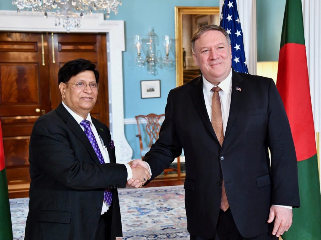 Shamim Ahmad, Washington, D.C., 08 April : Bangladesh Foreign Minister Dr. AK Abdul Momen MP today met with the US Secretary of State Mr. Mike Pompeo at the US State Department. This is the first meeting between the two leaders since their assumption of office in respective governments. Issues featuring in the meeting were: repatriation of the Rohingyas and creation of credible international pressure on Myanmar in that respect, deportation of Bangabandhu’s killer Rashed Chowdhury from USA to Bangladesh, shared vision of a Free and Open Indo-Pacific, US investments in Bangladesh, duty and quota free access of Bangladesh’s garments products in the US market and US-Bangladesh partnership in multiple sectors.