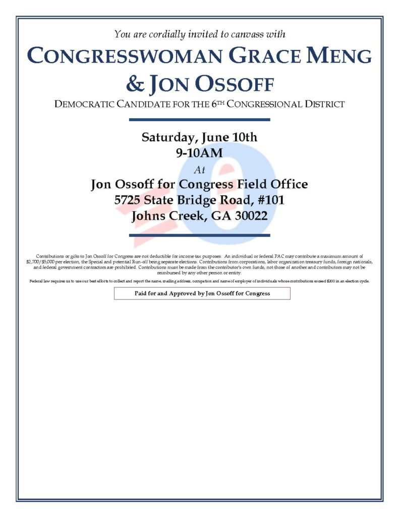 “Jon Ossoff is a smart and passionate candidate who will work across the aisle and join us in fighting the radical Trump agenda,” said Meng. “I am excited to campaign with him this weekend, and look forward to calling him my colleague after he ‘flips the sixth.'” Press Release.