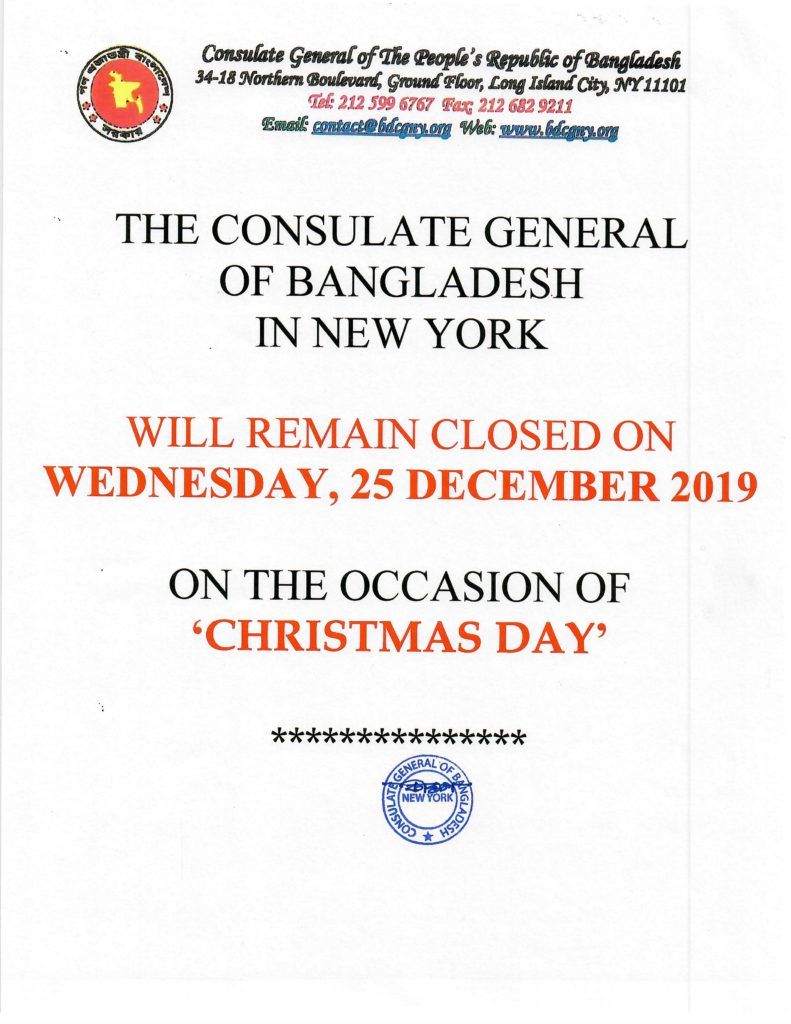 Holiday Notice from the Consulate General of Bangladesh in New York : Bangladesh Consulate General will remain closed on Wednesday, 25 December 2019 on the occasion of “Christmas Day.