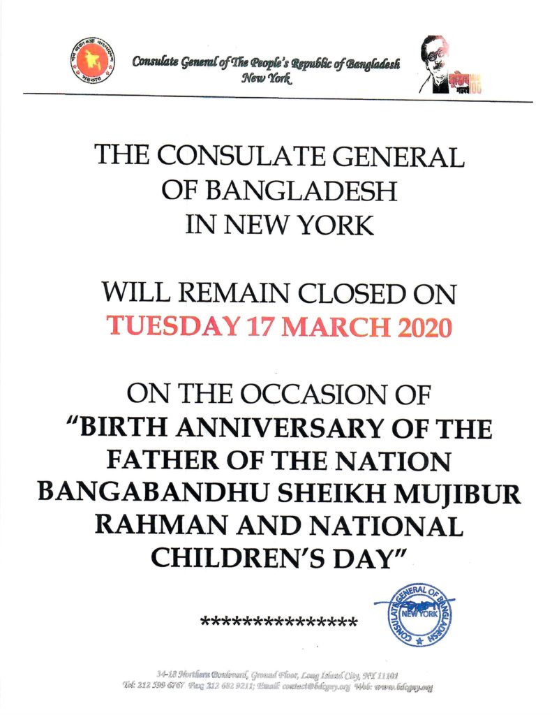 UsaNewsOnline.Com Desk, New York : Holiday Notice from the Consulate General of Bangladesh in New York : Bangladesh Consulate General will remain closed on Tuesday, 17 March 2020.
