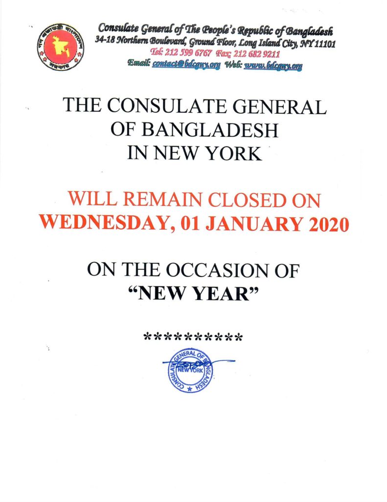 New York Bangladesh Consulate General will remain closed on Wednesday, 01 January 2020 on the occasion of “New Year”