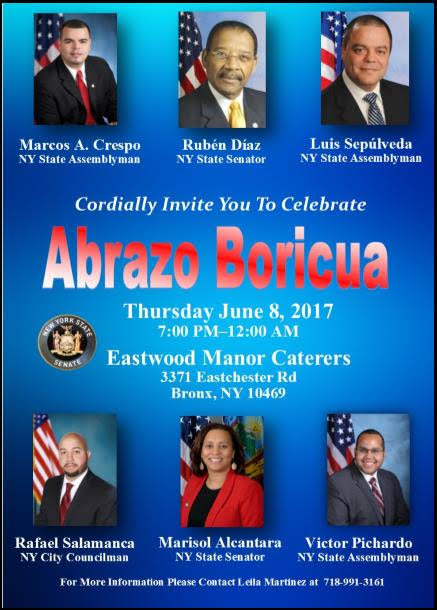 UsaNewsOnline.Com Desk, New York : Senator Rev. Rubén Díaz, in conjunction with New York State Assemblymen Marcos Crespo, Luis Sepulveda, Victor Pichardo, City Council Member Rafael Salamanca and Senator Marisol Alcantara will celebrate the Annual “Abrazo Boricua in New York.” “Abrazo Boricua” is a completely free annual banquet for the first 500 people, and it will take place at the Eastwood Manor Restaurant, located at 3371 Eastchester Road, Bronx, New York, on Thursday, June 8, 2017 from 7:00 p.m. to 12:00 a.m. This event will honor the many contributions that the Puerto Rican community has made for the State and City of New York . During this Banquet, Senator Rubén Díaz together with elected officials will be presenting Proclamations and Recognitions to distinguish members of the Puerto Rican community. For more information, please call Leila Martinez at 718-991-3161. Press Release.