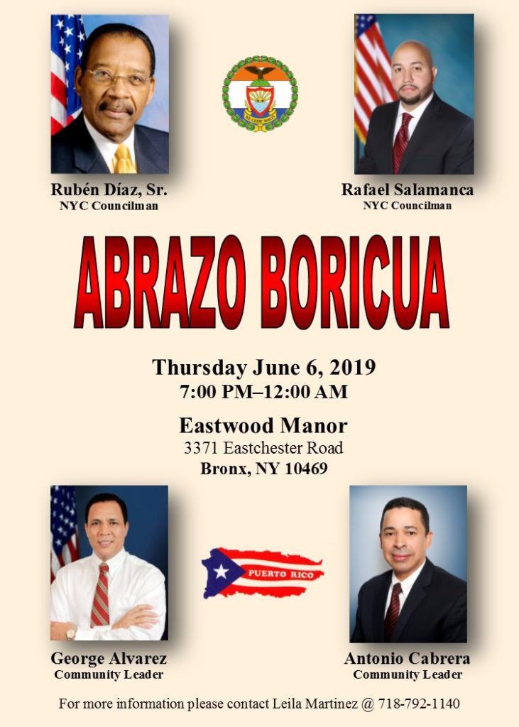 “Abrazo Boricua” is a completely free annual banquet for the first 500 people, and it will take place at the Eastwood Manor Restaurant, located at 3371 Eastchester Road Bronx, New York, on this Thursday, June 6, 2019 from 7:00 p.m. to 12:00 a.m.