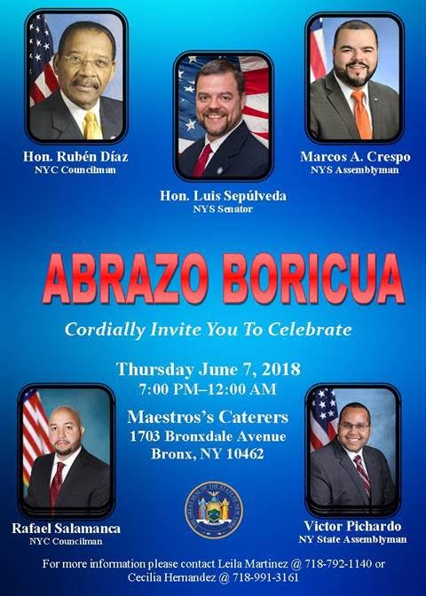 “Abrazo Boricua” is an entirely free annual banquet for the first 500 people, and it will take place at the Maestros Caterers Restaurant, located at 1703 Bronxdale Avenue, Bronx, New York, on Thursday, June 7, 2018, from 7:00 p.m. to 12:00 a.m. This event will honor the many contributions that the Puerto Rican community has made for the State and City of New York.