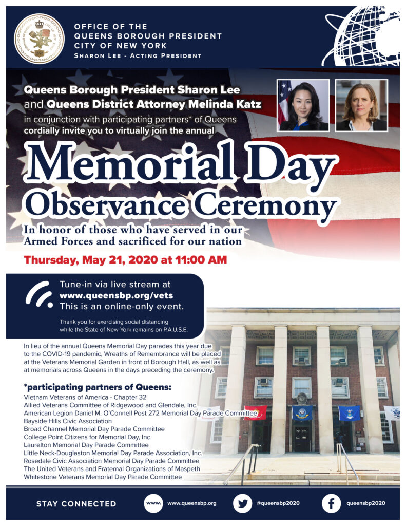 “Queens is eternally grateful to the women and men in the Armed Forces who served and perished in defense of our lives and our freedoms,” said Borough President LEE. “Although the extraordinary nature of these times has cancelled the slate of Memorial Day events across Queens, not even a pandemic will stop us from this annual, united observance in honor of those – and their families – who made the ultimate sacrifice. You are not forgotten.”