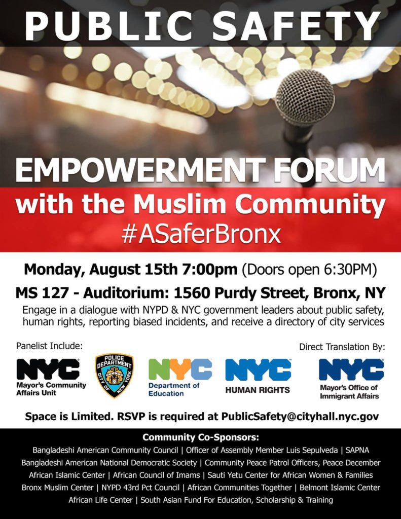 Mohammed Mujumder, LLM : As you probably know NYC Mayors office along with a few Community organizations including AM Luis Sepulveda,s office organized a very important security meeting to be held as follows: