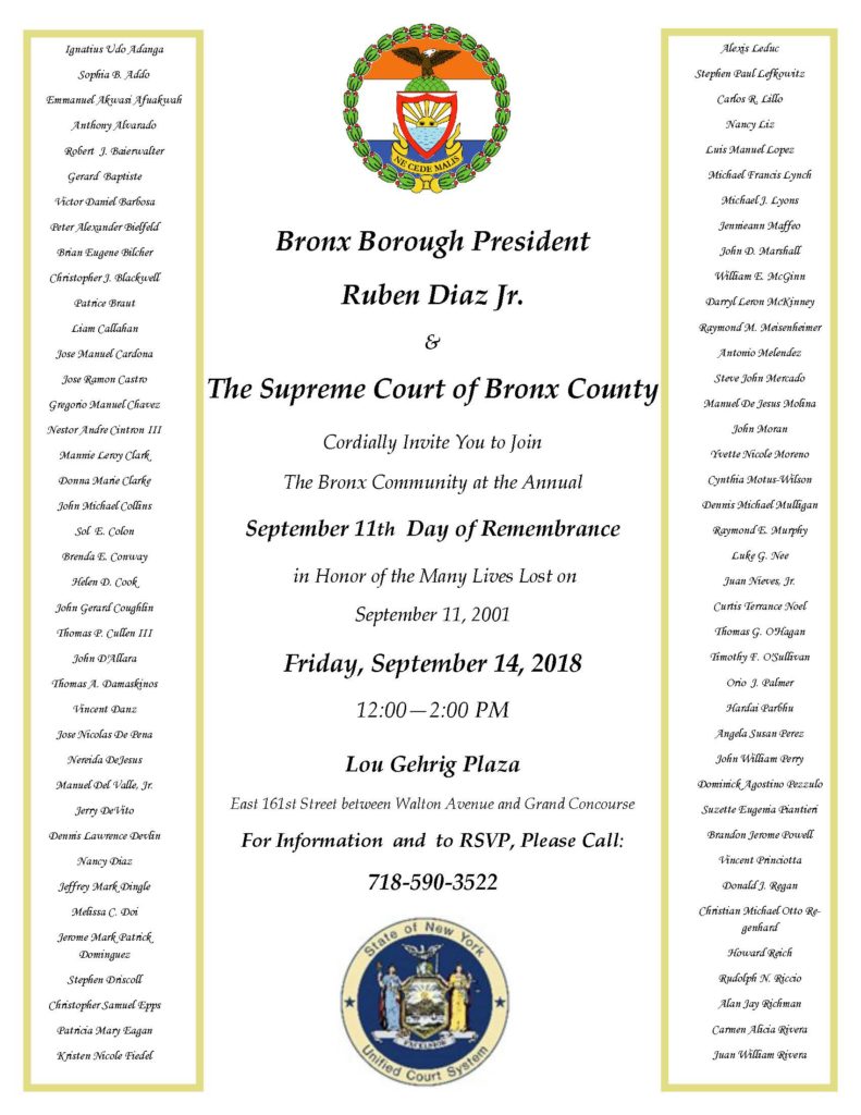 “My office’s annual ‘Day of Remembrance’ of 9/11 will take place this Friday. Each year, we come together to remember those we lost on 9/11 and to share with one another the feelings and emotions that are brought to the surface during this commemoration. All are welcome,” said Bronx Borough President Ruben Diaz Jr. Press Release.