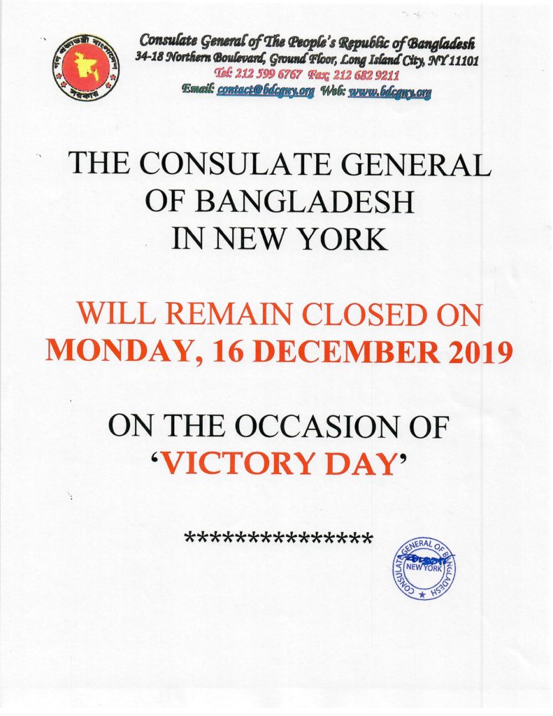 UsaNewsOnline.Com Desk, New York : Holiday Notice from the Consulate General of Bangladesh in New York : Bangladesh Consulate General will remain closed on Monday, 16 December 2019 on the occasion of “Victory Day”. Press Release.
