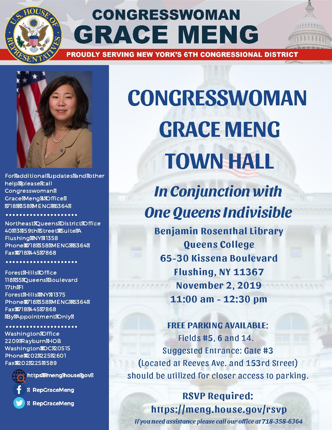 “I am excited to hold this upcoming town hall meeting and I encourage my constituents to attend,” said Meng. “I look forward to talking about my work in Congress and discussing the issues that concern the residents of the sixth congressional district.”