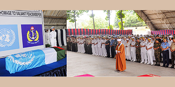 Later, the Navy chief handed over flags of the United Nations and Bangladesh Navy, cap, honorary sword and medal to the wife of martyred navy officer.