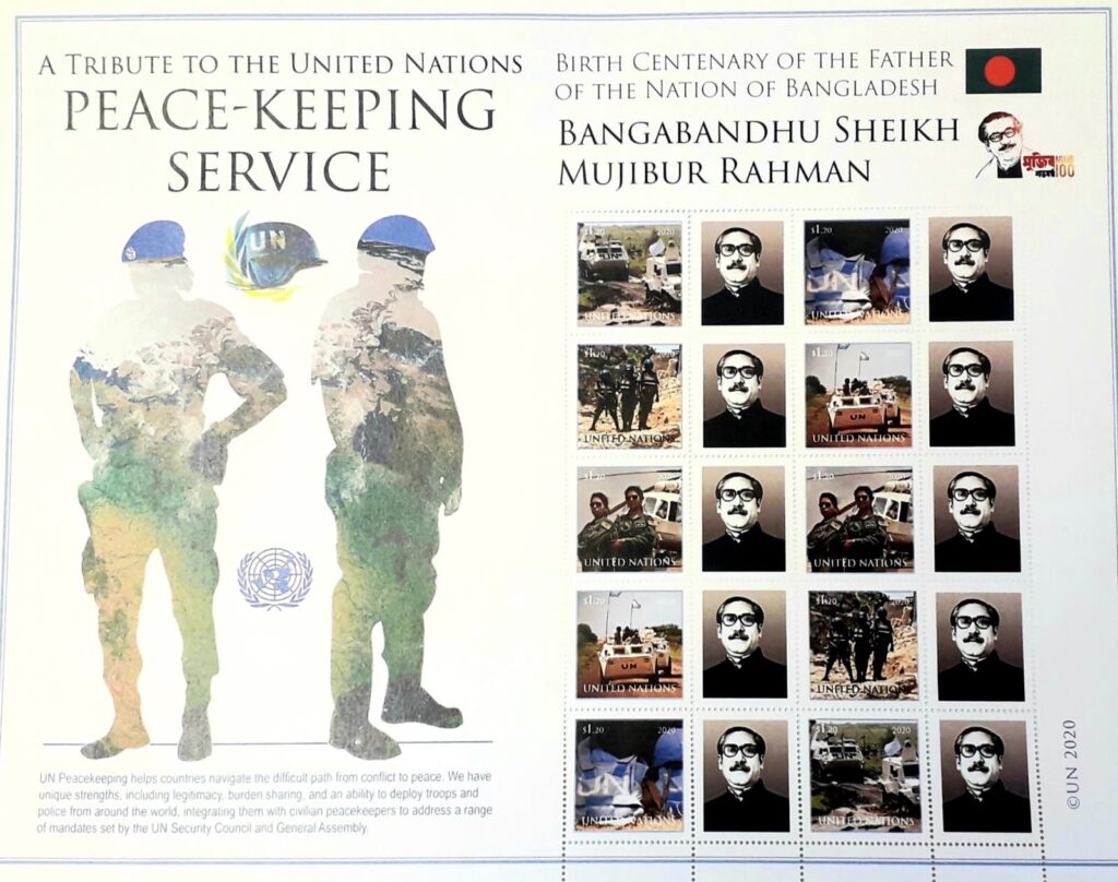 UsaNewsOnline.Com Desk, New York, 29 May 2020: Today, on the occasion of the ‘2020 International Day of the United Nations Peacekeepers (Peacekeepers Day)’ the UN Postal Administration, jointly with the Permanent Mission of Bangladesh to the UN in New York, issued a set of commemorative stamps as a tribute to UN peacekeepers and marking the Birth Centenary of the Father of the Nation of Bangladesh, Bangabandhu Sheikh Mujibur Rahman. The commemorative stamp folio features Bangladesh’s flag, logo of MUJIB 100, portrait of Bangabandhu and images of UN Peacekeeping services around the world. The images include the iconic posture of two Bangladesh female helicopter pilots, first ever deployed in the UN history.