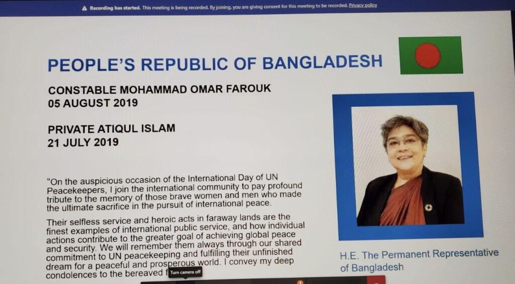 To observe the Day at the UNHQs in New York, UN Secretary-General António Guterres laid a wreath in honour of all fallen peacekeepers and paid tribute to those who carry their service in the cause of peace. The Secretary-General subsequently held a virtual ceremony to award Dag Hammarskjöld Medals posthumously to 83 peacekeepers who lost their lives in 2019. Two Bangladesh peacekeepers, Constable Mohammad Omar Farouk and Sainik Atiqul Islam, who made supreme sacrifice in line of duty in 2019, were also given this posthumous award. The PR of Bangladesh joined the PRs of other member states in the commemorative ceremony which carried a message from her given on the Day.