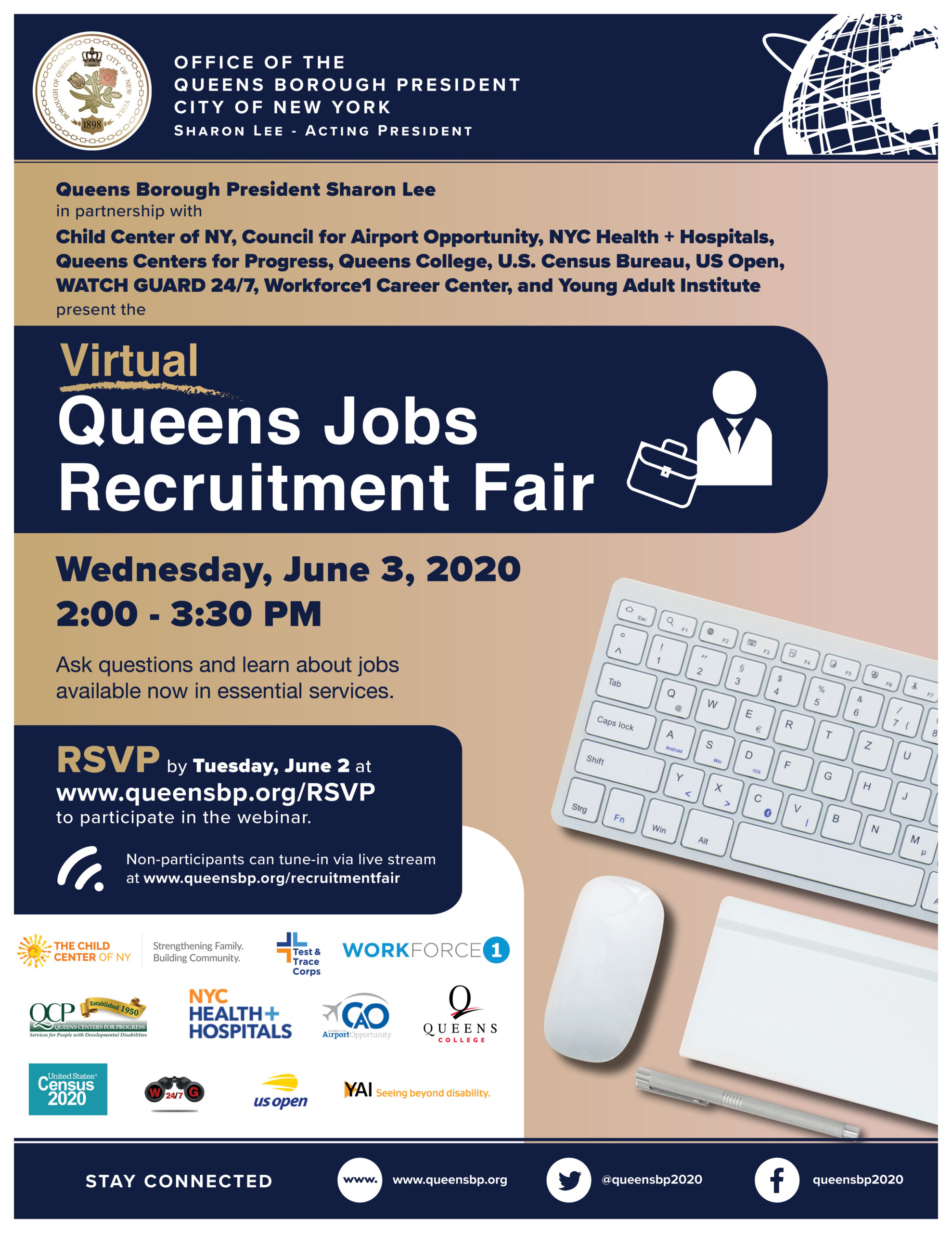 The next Virtual Queens Jobs Recruitment Fair will be held on Wednesday, June 3, 2020 online from 2:00PM to 3:30PM. Prospective applicants interested in participating in the live interactive Q&A via Zoom Webinar must RSVP by Tuesday, June 2 at www.queensbp.org/rsvp. The June 3 Jobs Recruitment Fair will also be livestreamed at www.queensbp.org/recruitmentfair.